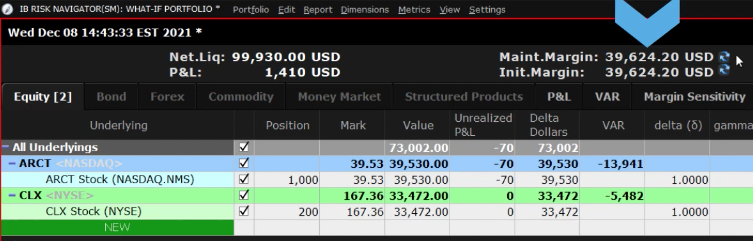 Let’s add another long stock position by following the same process. Click the green NEW button to start. This time when you enter the position size, notice that the initial and maintenance margin values did not yet change. However, there is now a blue/green swirl to the right of each value. That’s important and indicates that you must refresh the values by clicking on the swirl. Click to see updated margin requirements.