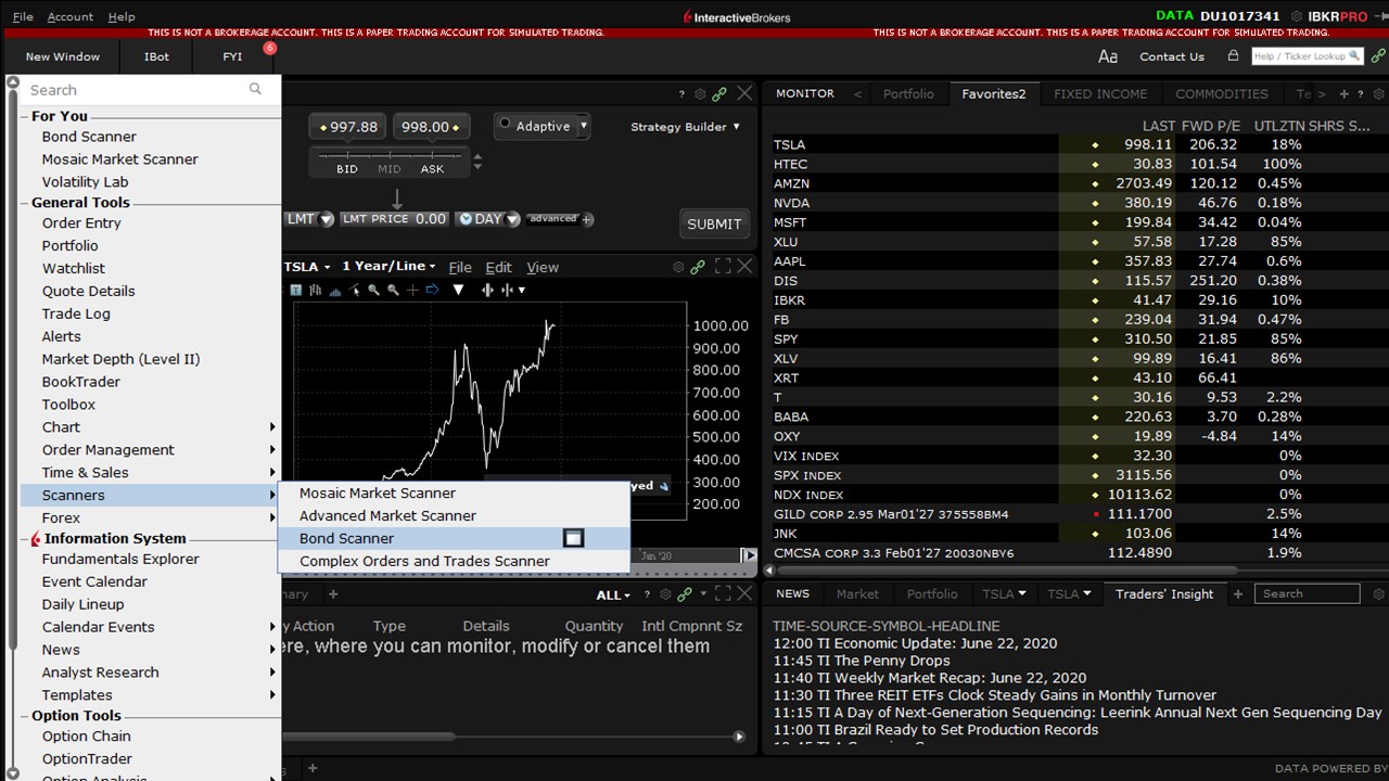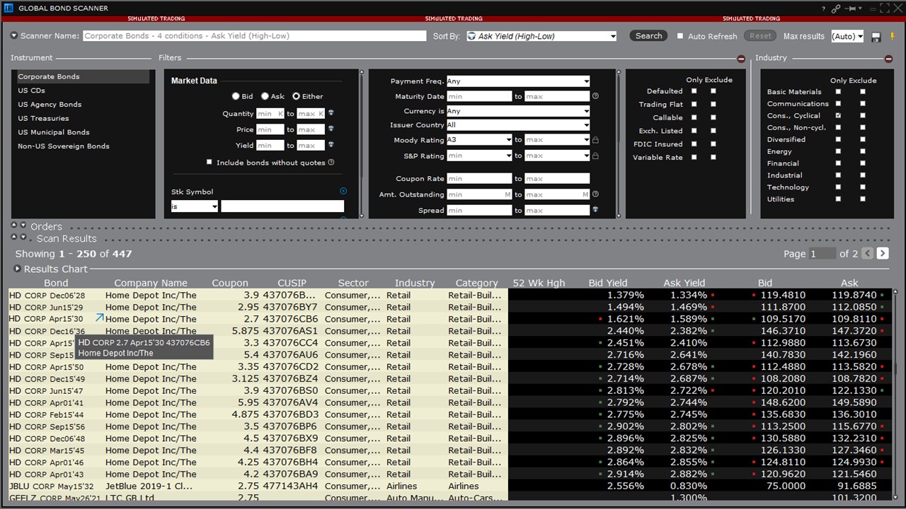 There are several ways to search for a corporate bond in the IBKR Trader Workstation (TWS), but for the purposes of this course, we’ll use the Bond Scanner to perform our work.