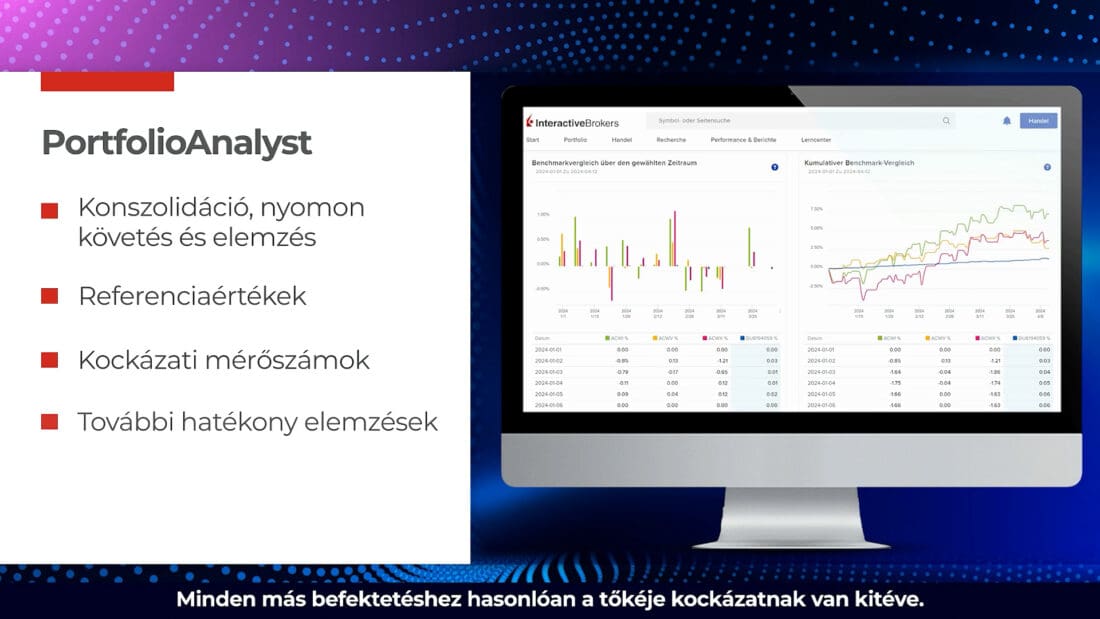 Ha az Ügyfélportál Teljesítmény és jelentések menüjében a PortfolioAnalyst-re kattint, eljut a pénzügyi teljesítménye egészének a konszolidálására, nyomon követésére és elemzésére hivatott átfogó elemzőeszközünkhöz, ami teljes körű képet ad például a referencia- és kockázati értékekről, és más fontos mérőszámokról.