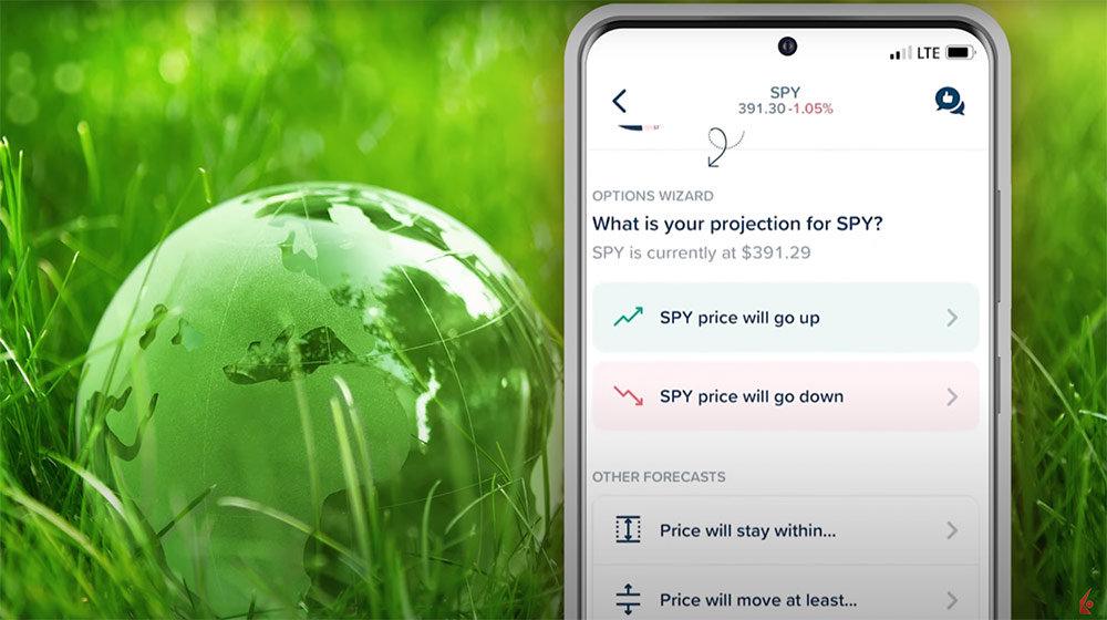 The investor can access the Option Wizard by choosing a symbol in the Watchlist, Portfolio, or Explore screen and tapping on the Options icon in the bottom right-hand corner. The Investor can also tap on the orange Trade icon in the lower right-hand corner of any screen, tap on Options and type a symbol or the name of a company into the search bar. Once selected, the investor can choose to either go to the Option Chain or use the Option Wizard by entering in their forward calculations on either price or volatility.