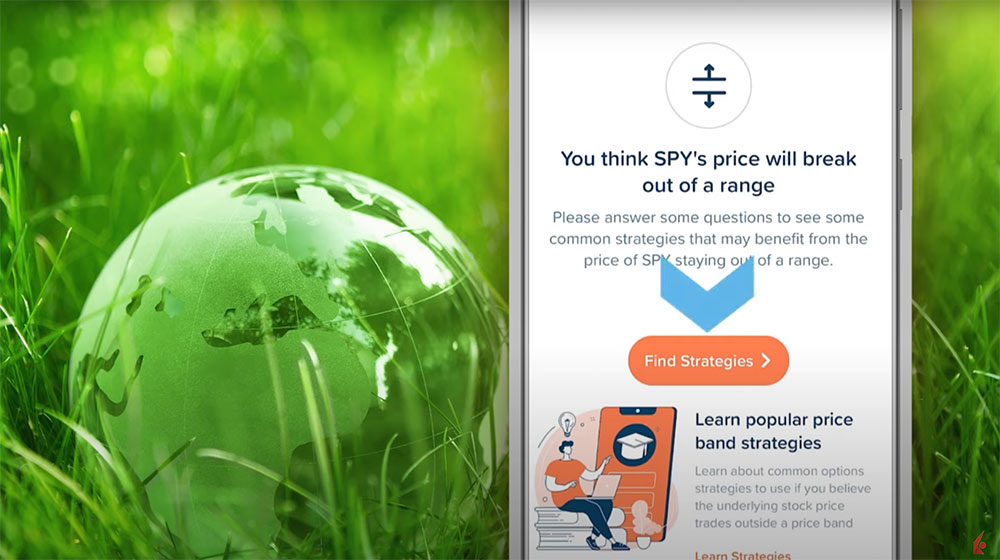 For this example, the investor believes the price of the underlying will move out of a certain range so they select “price will move at least”. The investor is taken to another screen confirming that they are calculating that the price is likely to break out of a range. Next, the investor taps on the orange Find Strategies button and chooses the time horizon in which they believe this event will occur by scrolling through the option expiration dates at the bottom of the screen. When ready, the investor taps the orange Next button.