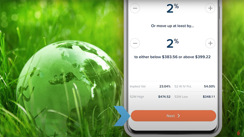 The investor can choose whether to use a percentage or currency value for the move and whether the underlying price will increase, decrease, or either. In this example, the investor chooses a 2% increase or decrease. When ready, they tap the orange Next button at the bottom of the screen.