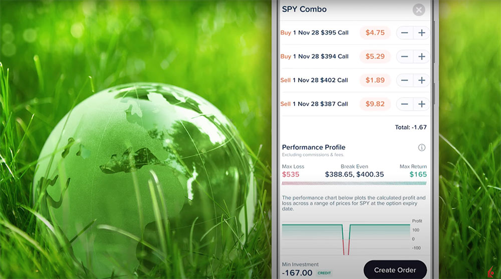 Once the investor selects a strategy, an informational screen will appear where the investor can adjust the strike ratio of the original strategy, see the total cost of the trade, excluding commission, see a Performance Profile of the strategy showing the max loss, breakeven point or points, and the max return as well as other relevant information. When ready, the investor taps the Create Order button in the bottom right-hand corner of the screen.