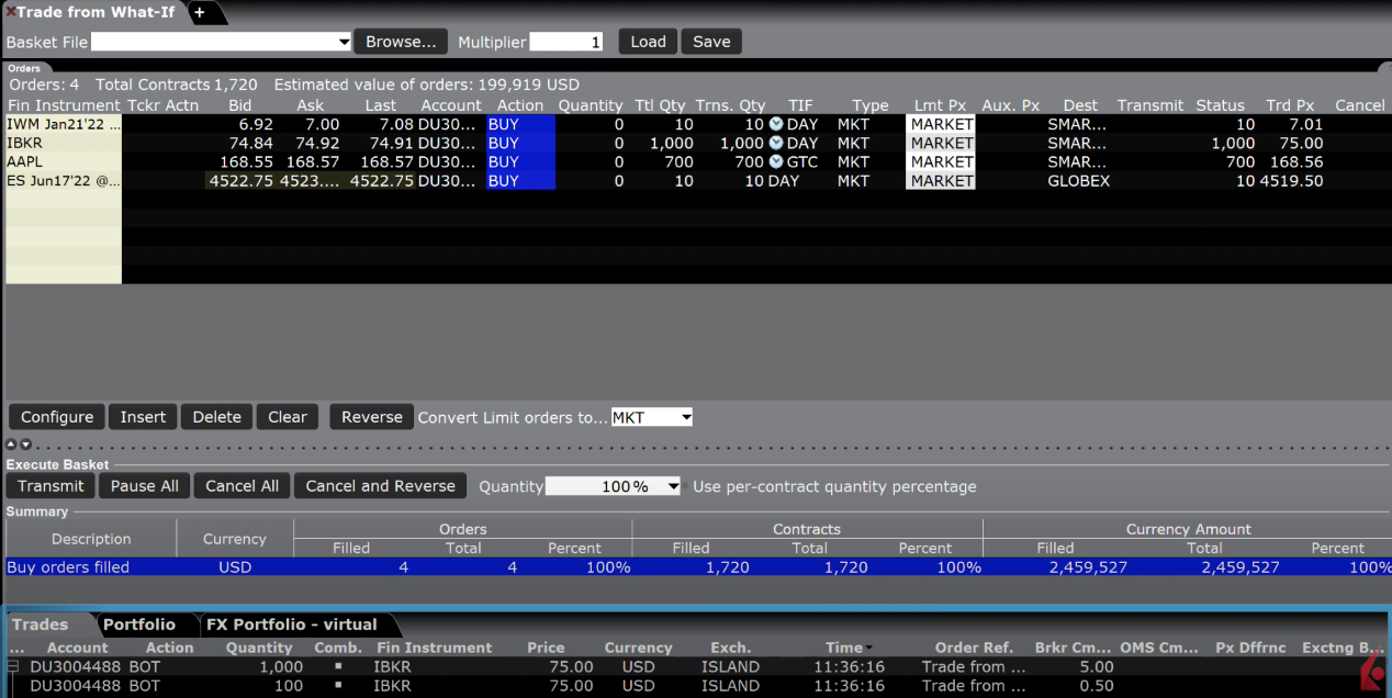 A single order will populate the pending tab in Classic TWS. If you are trading multiple instruments the TWS BasketTrader will pop up on the screen populated with the orders necessary to replicate the hypothetical position you created in the what-if. Notice that the total quantity of the stock orders are not for buying 1,000 but for the appropriate size to make the overall position in my portfolio equal 1,000 of each. You can adjust the size, order type, time in force and destination for the order from the BasketTrader as well. When ready, click Transmit for each individual order or click Transmit in the Execute Basket section toward the bottom left of the BasketTrader to send all orders at once. You can check the progress of the orders in the Summary area.