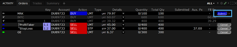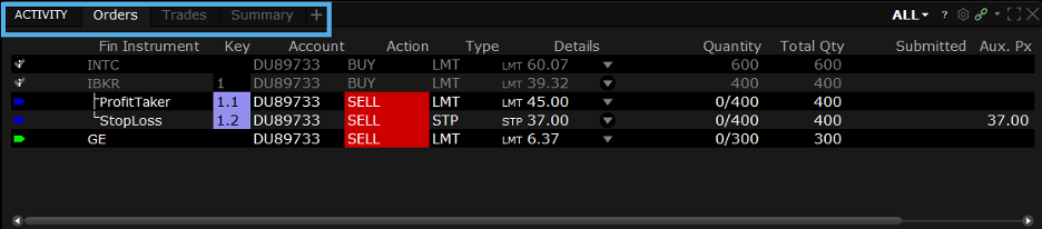 Orders created and saved anywhere within TWS will appear in the Activity monitor in the lower left of your Mosaic display. This enables you to keep track of resting and working orders, review filled orders and quickly adjust should you choose.