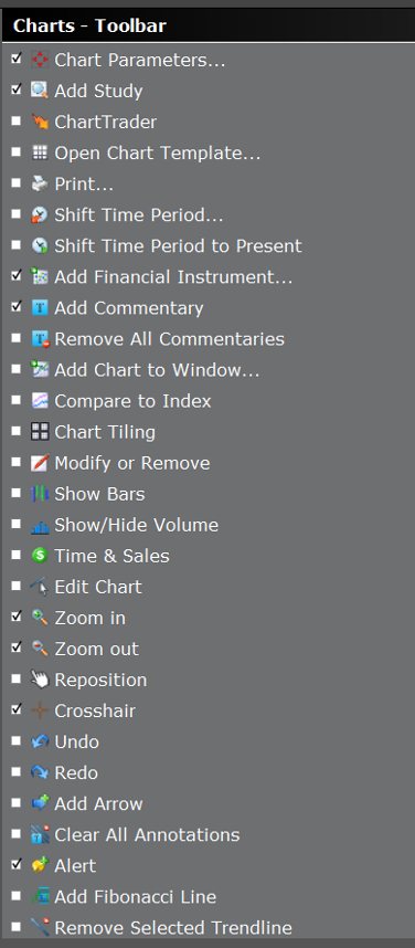 As you can see from the Toolbar configuration menu, there are many icons to choose from. As an investor, you should be able to quickly recognize which ones you will likely use most frequently. Several of these icons are self-explanatory, but let’s review a few more.