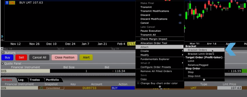 To attach an order, let’s return to the horizontal blue buy line by right-clicking and seeing the double arrowhead, where you can bring up the Attach menu.