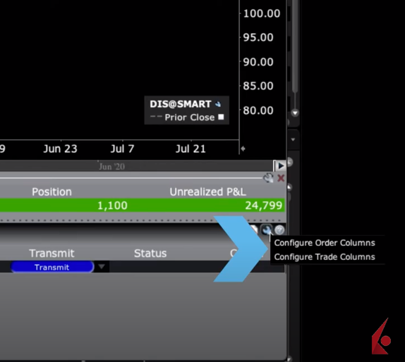 Turning to the Order Panel below this chart, you will see a wrench icon in the upper right of the display, which you can click as a shortcut to the configuration menu for either Trade or Order Column display.