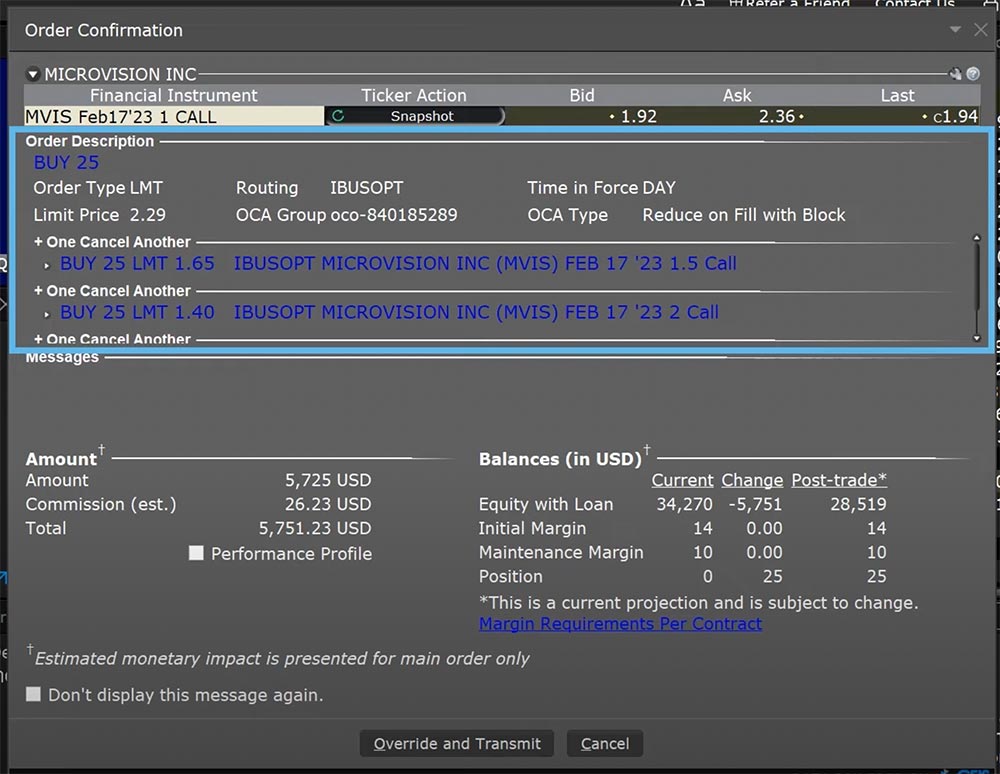 An investor can place multiple option orders using the “One-Cancels-Another” or OCA order attribute in the Interactive Brokers (IBKR) Trader Workstation (TWS) Mosaic order entry panel with the aim of filling one of them completely and automatically cancelling the others or partially filling more than one to equal a final quantity.