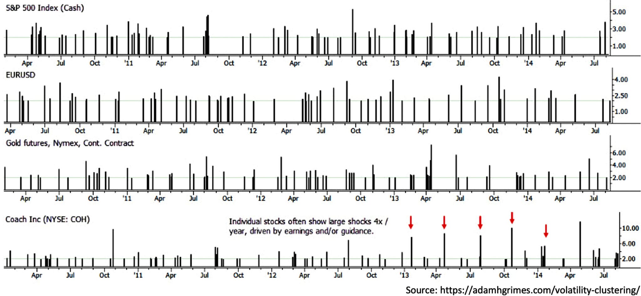 Volatility shocks fade away. (Think of the example of a large rock thrown in a quiet pond.)