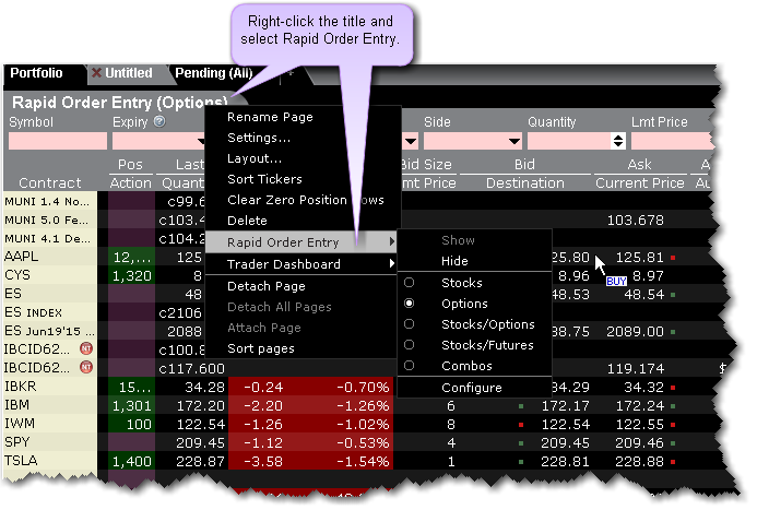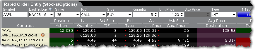 如果你输入最后交易日、执行价、和P/C区域,快速定单输入面板将假设您在创建一个期权或期货定单,并使用当前价格为默认限价价格。如果你没有在这些区域输入,快速定单输入面板将假设创建一个股票定单并使用股票价格为默认限价价格。。