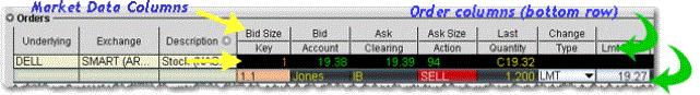 上面的图示中,上方标题行(买价尺寸、买价、卖价、卖价尺寸 等- Bid Size, Bid, Ask, Ask Size etc)和下方市场数据行是对应的(1, 19.38, 19.39, 94 等)。底部标题行(定单号,账户,清算 等- Key, Account, Clearing etc)和下方数据行的定单信息相对应(1.1, Jones, IB etc.)。