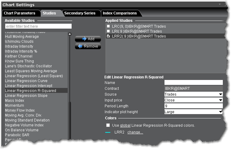 2. 选取线性回归R平方(Linear Regression R-Squared)并点击添加将指标添加应用指标中。